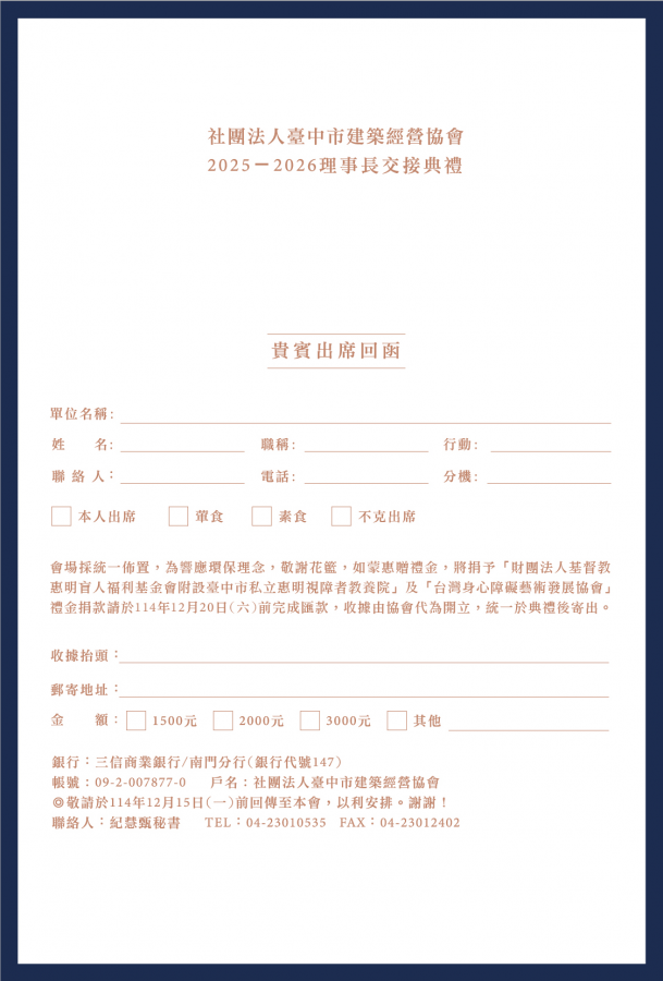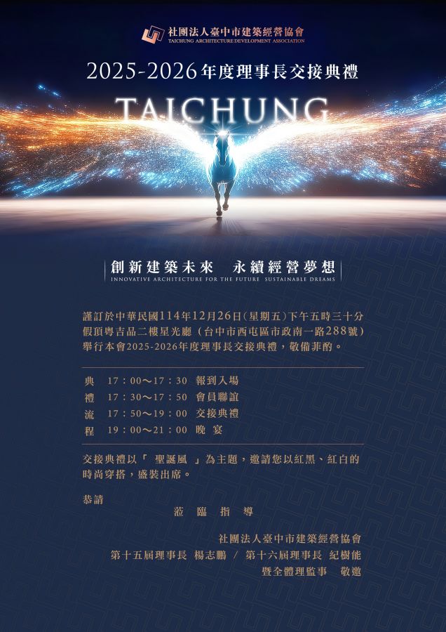 ◎說明日期:114年12月26日(星期五) 時間:下午5:30~9:00(5點開始報到) 地點:頂粵吉品二樓星光廳(台中市西屯區市政南一路288號) **Dress Code** 以「 聖誕風 」為主題,邀請您以紅黑、紅白的時尚穿搭,盛裝出席。