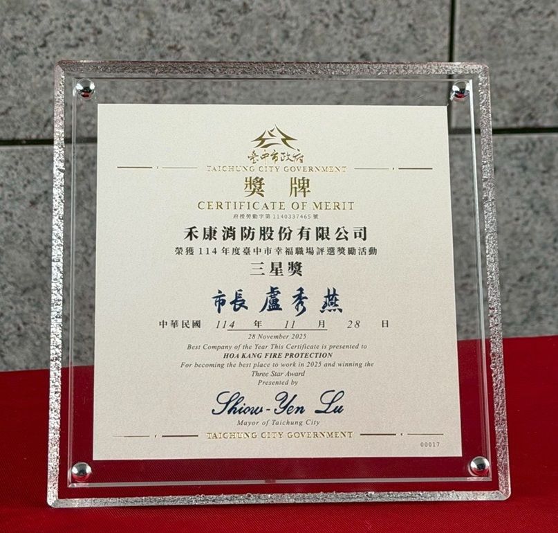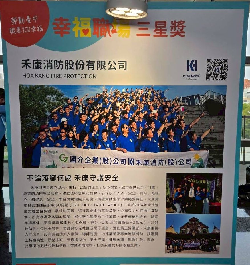 禾康消防股份有限公司深耕消防工程領域二十年餘年,以「打造安心、信任與成長並行的友善職場」為核心,推動多項員工關懷與幸福職場措施。114年度榮獲「台中市幸福職場評選活動三星獎」,象徵市府對禾康消防幸福職場文化的高度肯定。