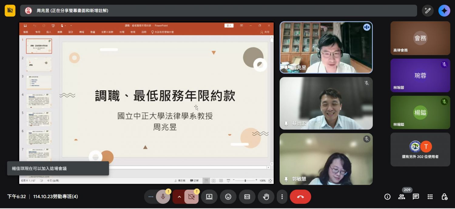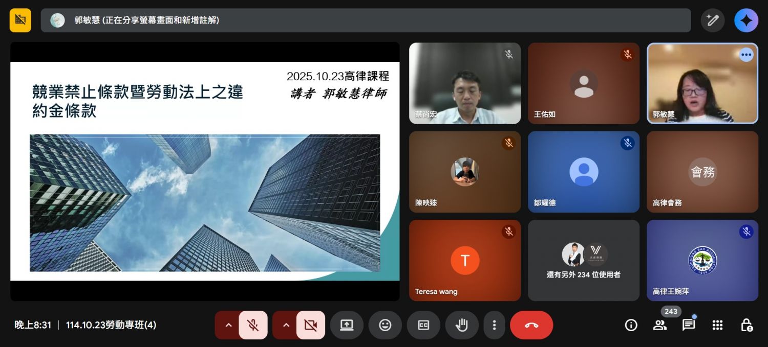 114年10月23日114年度勞動律師專業課程培訓班第4堂視訊課程