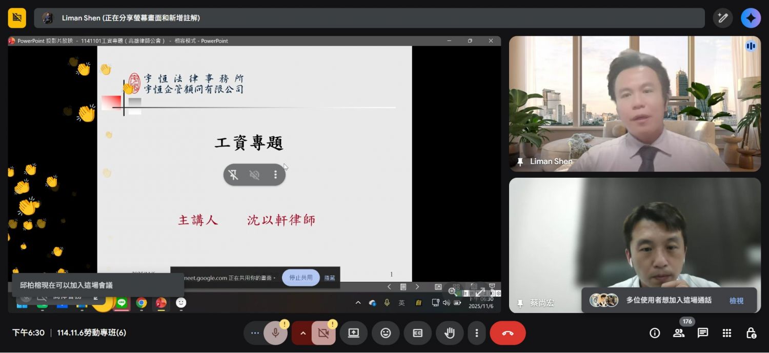 114年11月06日114年度勞動律師專業課程培訓班第6堂視訊課程
