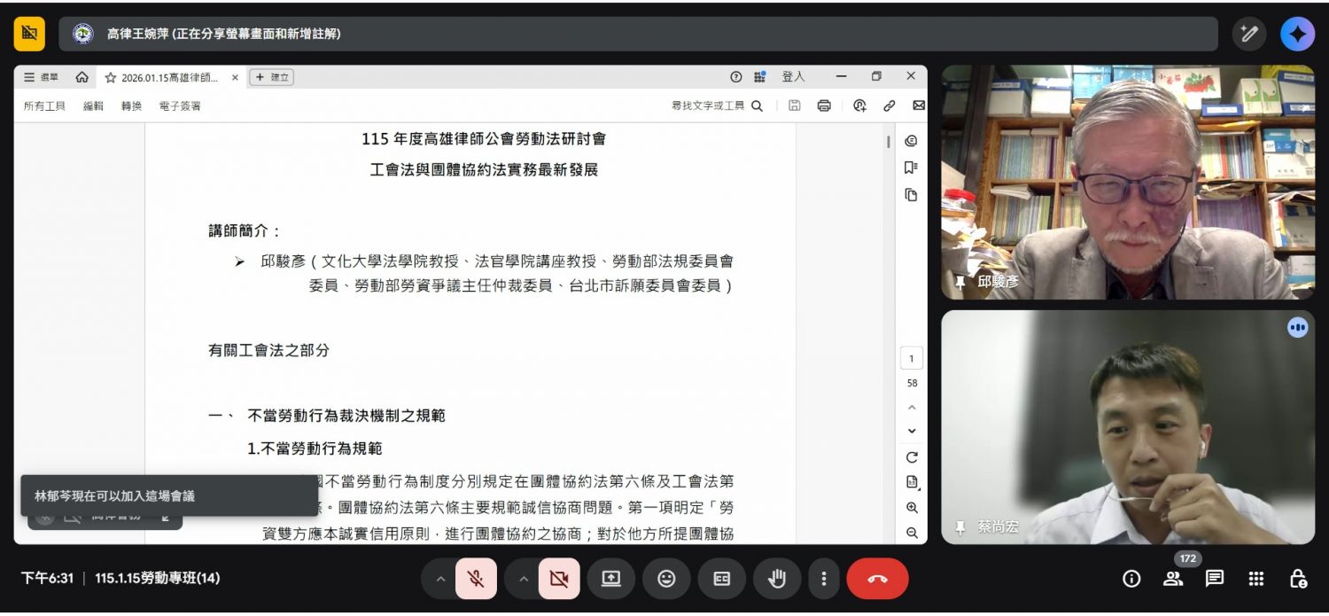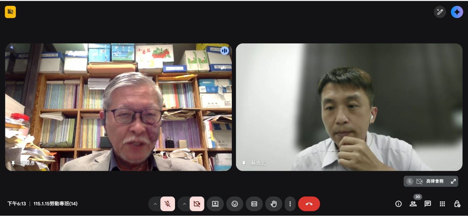 115年1月15日114年度勞動律師專業課程培訓班第14堂視訊課程
